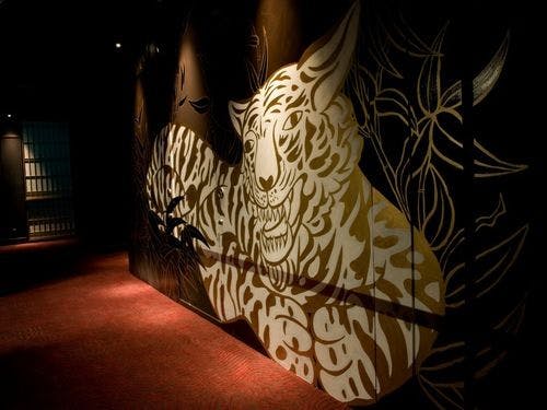 四季を感じるエントランス KIZASHIのシンボル「蝶・桜」から始まり、「鹿・紅葉」「虎・竹」と四季を表した斬新な壁画が皆様をお迎えします。