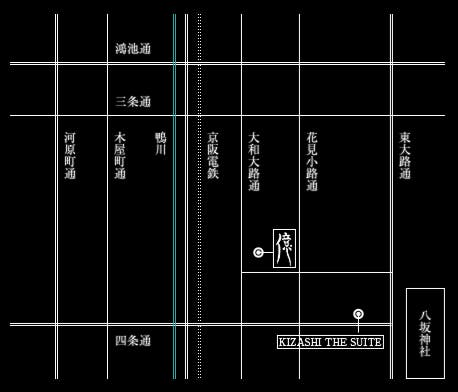 ■阪急電鉄「河原町駅」より徒歩10分 ■京阪電鉄「祇園四条駅」より徒歩5分 ■京阪バス「祇園停留所」目の前 ■京都駅からタクシーで約20分