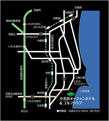 【お車でお越しの場合】 三郷IC→常磐自動車道経由・いわき勿来IC→国道6号方面→ホテル または、いわき小名浜IC→小名浜道路→県道239号線→ホテル 郡山JCT→東北自動車道→盤越自動車道・常磐自動車道経由→いわき湯本IC→国道6号方面→ホテル または、いわき小名浜IC→小名浜道路→県道239号線→ホテル 【電車でお越しの場合】 JR上野駅→JR常磐線/特急「ひたち」→JR泉駅南口→ホテル(車で約10分)