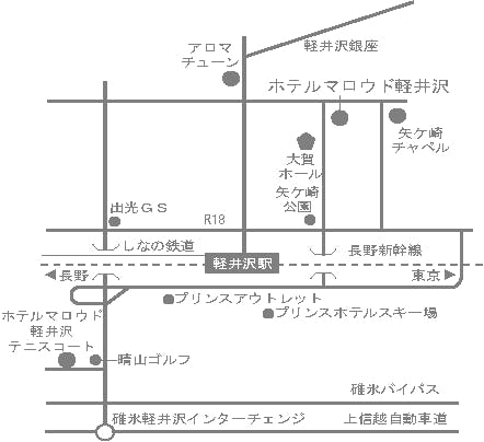 【電車でお越しの場合】 東京駅→(長野新幹線・約1時間)→軽井沢駅→徒歩10分 ※軽井沢駅より無料送迎がございます。 (時間 9:00~18:00 軽井沢駅北口到着時にホテルへご連絡下さい) 【お車でお越しの場合】 練馬IC→(関越自動車道)→藤岡JCT→(上信越自動車道)→碓氷軽井沢ICより約15km(平常時約20分)