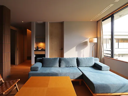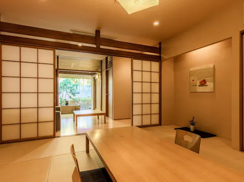 「クラブエリア 温泉付離れ」にご宿泊の方専用のクラブラウンジ。 世界に誇る山口の地酒・山口県産の果実ジュースなどのお飲物をご用意しております。種田山頭火や金子みすゞなど山口県出身作家の句集や詩集、また暮らしや文化をテーマにした書籍を自由にお読みいただけます。やわらかな灯りと地酒でゆったりとした上質なひとときをお過ごしください。