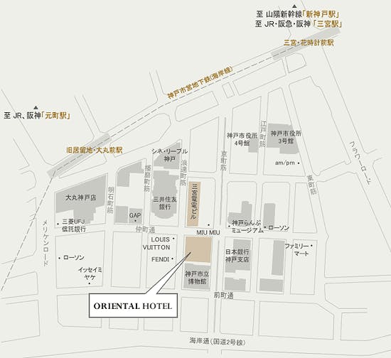 THE ORIENTは、重厚な石造りの建物や洋館が点在する、旧居留地の中心部に位置しております。JR神戸線 三ノ宮駅より車で約5分の場所にございます。ホテル最上階のロビーやレストラン、客室からも神戸港や六甲山の美しい景色が見渡せます。異国情緒あふれる美しい港町、神戸をお愉しみ頂けます。
