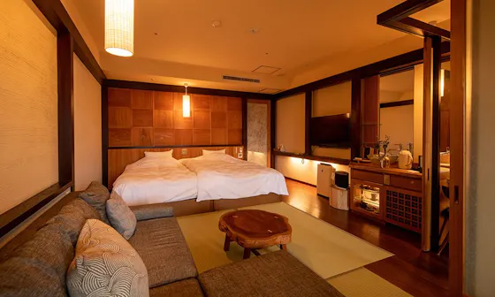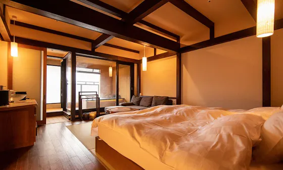 外輪山を見渡せる絶景露天風呂や森に囲まれた露天風呂など自然と一体になれるお風呂を全客室にご用意いたしました。お好きな時間に気兼ねなく楽しめる、贅沢なひとときをご堪能ください。