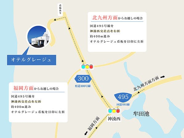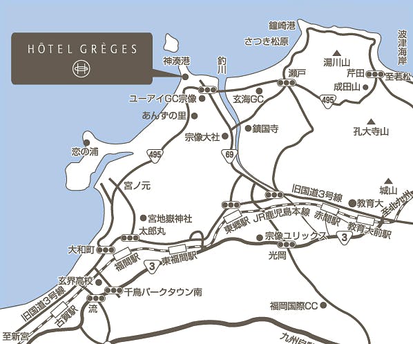 ■お車で 九州道 / 古賀IC・若宮ICより約30分 都市高速 / 香椎東ランプより約40分 神湊港・鐘崎港より約3分 福岡空港より約60分 ■公共交通機関で JR東郷駅よりタクシーで約15分 JR東郷駅よりバスで約25分 JR赤間駅よりタクシーで約20分