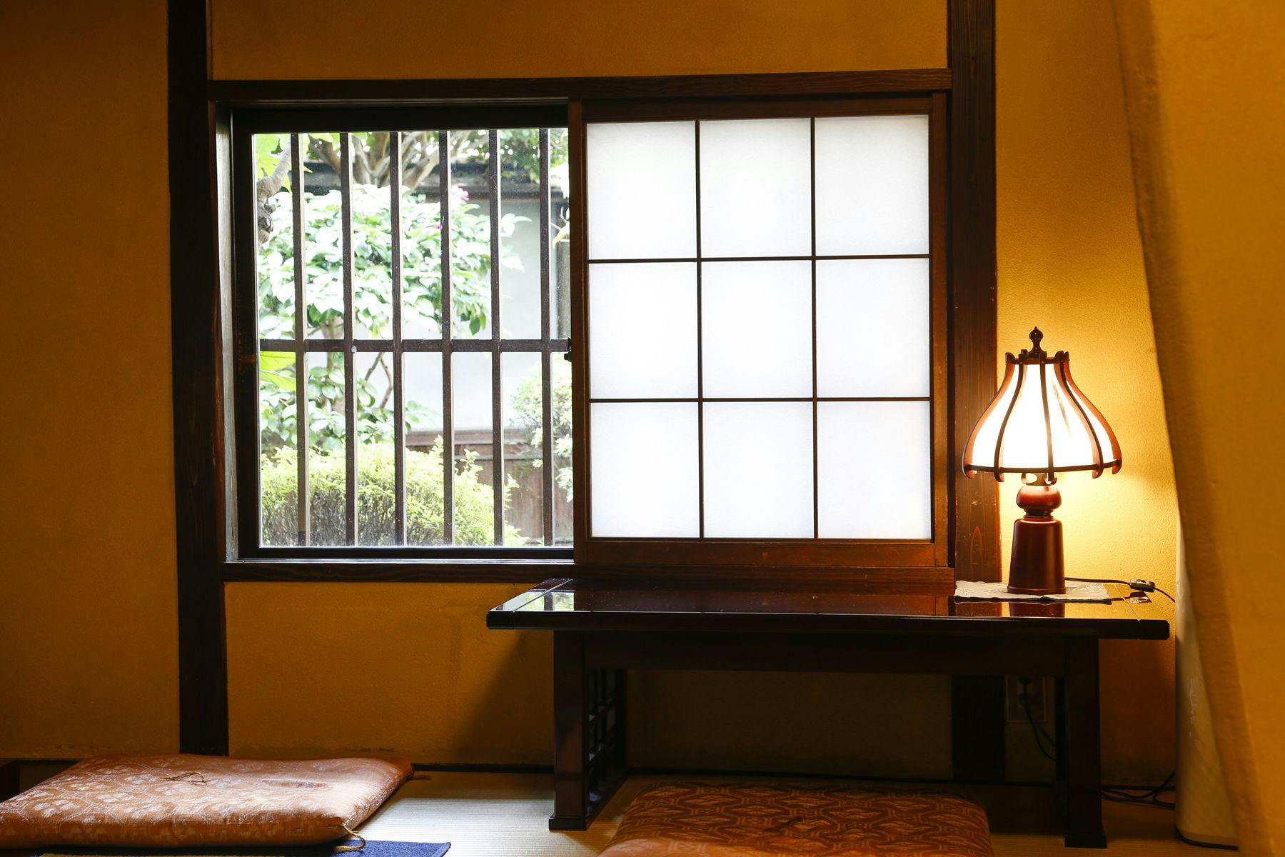 弁柄いろ 円窓の庭 薄紅色の切り返しのある障子まったりとした空間に心休める。