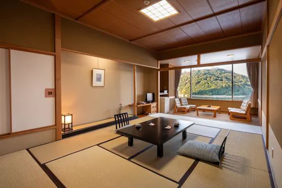 浜名湖を望む老舗旅館で、自慢の料理と総檜造りの温泉大浴場を満喫