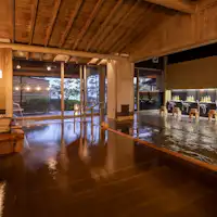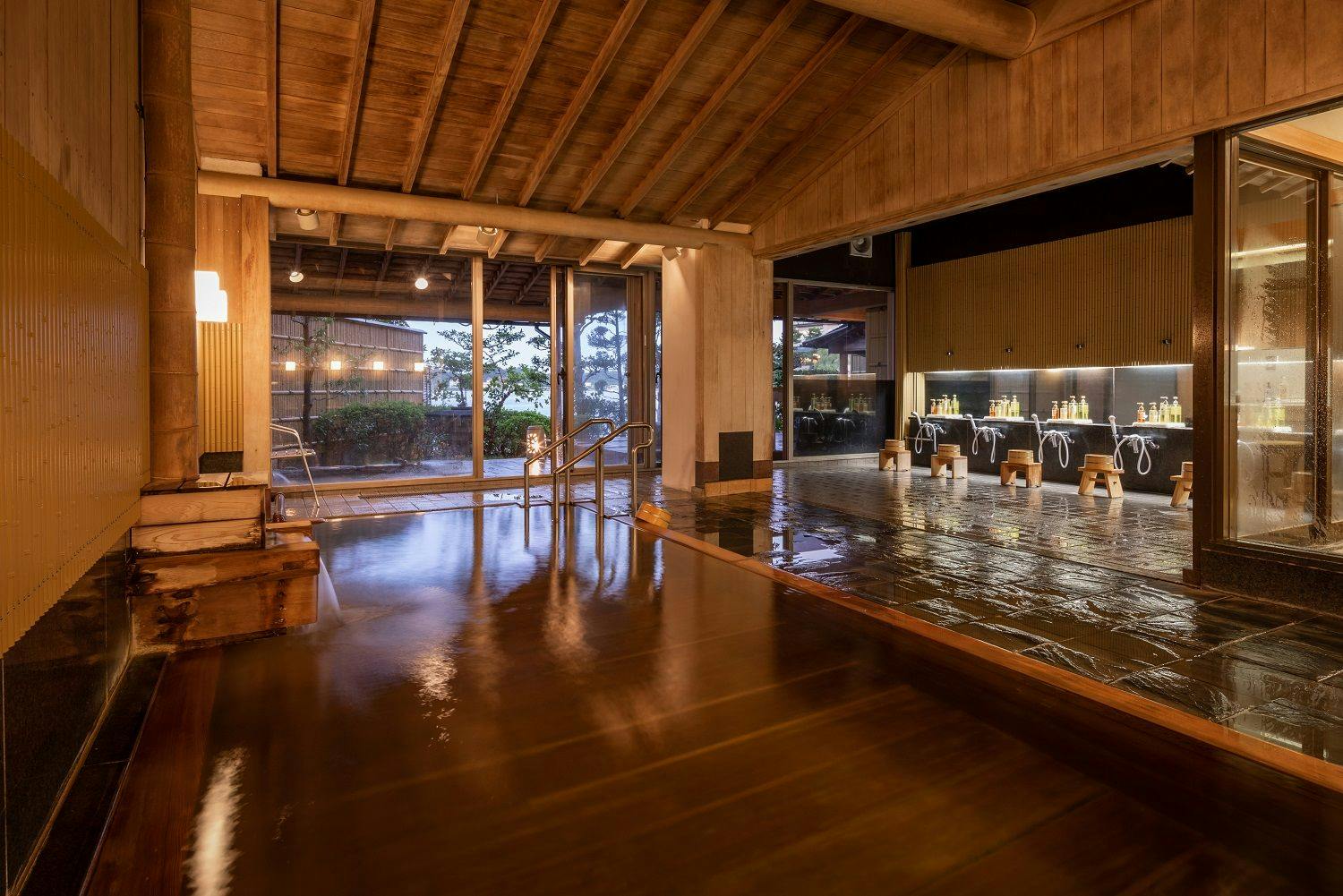 当館自慢の総檜造り温泉大浴場です。「汰浪の湯(殿方)」「華湖の湯(ご婦人)」ともに総檜の大浴場と趣向を凝らした露天風呂をお楽しみいただけます。