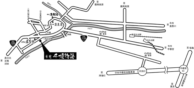 <電車で・・・> ○JR東京駅→宇都宮→JR日光(1時間30分) ○JR新宿・池袋・大宮→東武日光(直通特急電車で新宿から2時間) ○東武浅草→東武日光(スペーシアで1時間40分) <お車で・・・> 首都高速(川口JCT.)→宇都宮I.C(東北自動車道)→日光I.C(日光宇都宮道路)→日光千姫物語