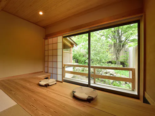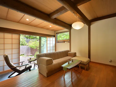 四季の木々に包まれる、明るく風通しの良い敷地内には、別荘を思わせる離れ形式と、 古民家の趣に癒される母屋の全客室にて「露天風呂付き客室」をご用意しております。 都会を離れ、実家や田舎に帰ってきたような、気を使わずのんびりできる時間と、 雄大な山々・水源風景が広がる景色を味わっていただける、お客様にとって居心地の良い癒しの場所です。