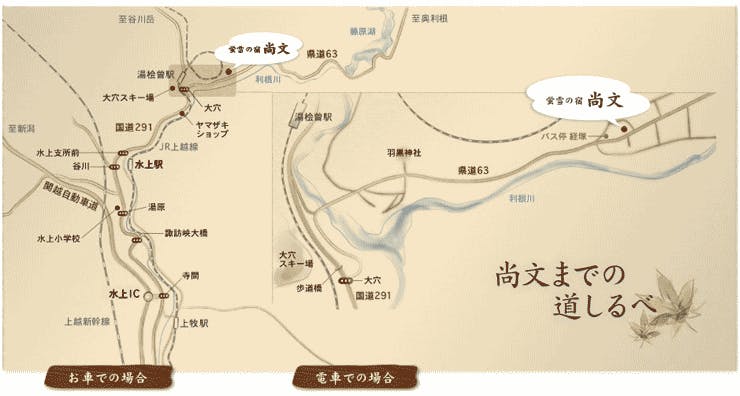 【お車で】関越自動車道 水上I・C下車 約15分 【電車で】 <水上駅まで> ・上野駅よりJR特急水上にて水上駅へ(約2時間20分) ・上野駅よりJR上越新幹線にて高崎駅へ、乗換後JR上越線にて水上駅へ(約2時間) ・上野駅よりJR高崎線にて高崎駅へ、乗換後JR上越線にて水上駅へ(約3時間) 水上駅よりバスで約15分、バス停「経塚」下車後徒歩1分