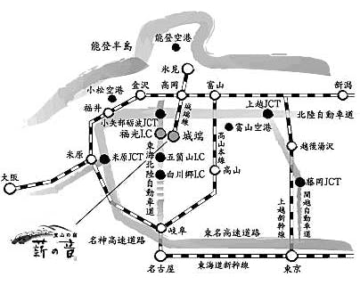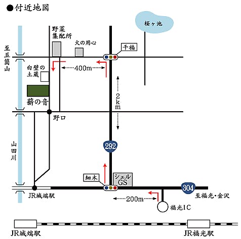 【公共交通機関をご利用の場合】 無料送迎あり(要予約) 関東方面 東京駅より新高岡駅まで 北陸新幹線で2時間30分 新高岡駅よりJR城端駅まで JR城端線で50分 関西方面 大阪駅より敦賀までサンダーバード利用 敦賀より新高岡まで北陸新幹線利用 新高岡よりJR城端駅まで JR城端線で50分 名古屋方面 名古屋より城端SAまで高速バス利用 3時間 金沢方面 金沢駅よりJR福光駅前/JR城端駅前まで バスで50ー60分 【お車をご利用の場合】 福光I.Cより薪の音まで約5分 ○金沢 ~ 福光I.C 北陸・東海北陸自動車道 約30分 ○富山 ~ 福光I.C 北陸・東海北陸自動車道 約40分 ○名古屋 一宮I.C~ 福光I.C 178K 名神・東海北陸自動車道 約2時間30分 ○大阪 ~ 福光I.C 名神・北陸・東海北陸自動車道 約3時間30分 ○東京 ~ 福光I.C 関越・北陸・東海北陸自動車道 約7時間