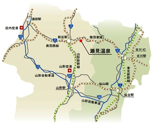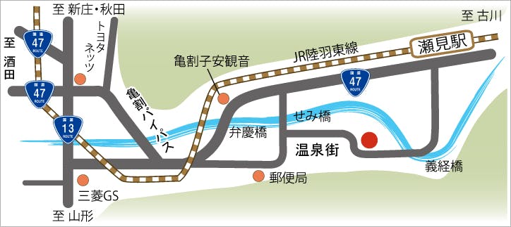 JR陸羽東線、瀬見温泉駅より徒歩8分/新庄より車で15分