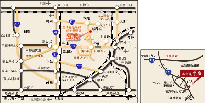 【電車でお越しのお客様】JR高山線・高山駅~濃飛バス(新穂高温泉行)「新平湯禅通寺前」下車徒歩3分 【お車でお越しのお客様】東海北陸道・清見IC