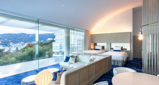 海峯楼唯一の和室では、障子と畳に囲まれた日本らしい空間でゆったりとした時間をお過ごしいただくことができます。 幻想的な日の出を望むことができる大きなガラス窓には、窓際オリジナルデザインのクッションを敷き詰め、のんびりと海を眺めて贅沢なひとときを。 寝具は快適な睡眠をお約束するオリジナルの布団をご用意しております。
