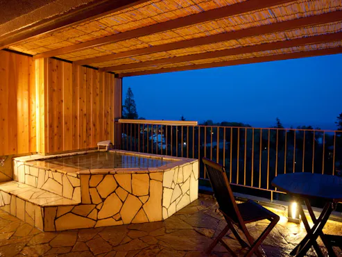 伊豆高原の静かな別荘地に佇む全室露天風呂付きの隠れ宿。 すべてのお部屋に露天風呂を備え喧騒を離れ、穏やかな時間をお過ごしいただけます。 お食事は旬の恵みを大切に、すべて手作りにこだわり一品一品丁寧にご用意。 季節ごとに趣を変える創作くずし懐石は、旬の恵みを五感で味わう特別なひととき。 自然の息吹とともにプライベートな時間を心ゆくまでお過ごしくださいませ。