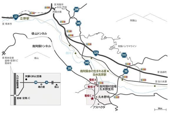 ・阿蘇くまもと空港から車で約25分 ・熊本ICから車で約30分 ・熊本益城空港ICから車で約30分 ・南阿蘇鉄道 白水高原駅より車で10分