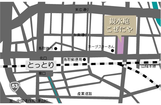 【JRで】鳥取駅から徒歩約8分。タクシー約2分。 ※JR鳥取駅北口よりJR高架線沿いに約500m先です。 ※駅前の信号から4つ目の交差点角にあります。 ●東京→鳥取 5時間00分(新幹線・智頭急行) ●大阪→鳥取 2時間30分(智頭急行) ●岡山→鳥取 1時間50分 ●広島→鳥取 2時間40分(新幹線・智頭急行) ●博多→鳥取 4時間00分(新幹線・智頭急行) 【高速バスで】鳥取駅およびバスターミナルから徒歩約10分。タクシー約2分。 ●東京→鳥取 9時間30分 ●岡山→鳥取 2時間50分 ●京都→鳥取 3時間20分 ●大阪→鳥取 2時間45分 ●福岡→鳥取 11時間00分 ●神戸→鳥取 2時間35分 ●広島→鳥取 4時間20分 【飛行機で】鳥取空港からタクシーで約20分。 ●東京→鳥取 1時間10分 【お車で】中国自動車道「佐用JCT」経由、鳥取自動車道「鳥取IC」より車で8分。 ●東京→鳥取 9時間30分 ●名古屋→鳥取 5時間00分 ●京都→鳥取 3時間20分 ●大阪→鳥取 2時間45分 ●姫路→鳥取 1時間50分 ●岡山→鳥取 2時間50分 ●広島→鳥取 4時間20分