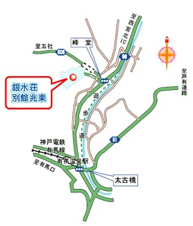 【お車をご利用の場合・・・】 中国道西宮北インターより約10分 阪神高速北神戸線有馬口インターより約5分 (大阪より約60分、三宮より25分、京都より約60分、姫路60分) 【公共機関をご利用の場合・・・】 <電車>神戸電鉄「有馬温泉駅」より徒歩10分(無料送迎有り) 三宮から約30分、大阪から約60分(各乗換有り) <バス>大阪より60分、三宮から35分