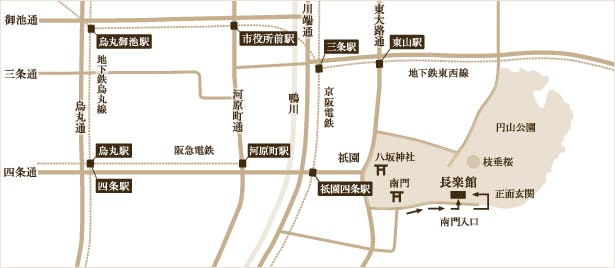 JR京都駅からタクシー 所要約15分 JR京都駅から市バス(206番もしくは100番にて祇園で降車ください) 所要約30分 阪急河原町駅から徒歩 所要約15分 京阪祇園四条駅から徒歩 所要約10分 「祇園」のバス停より徒歩5分