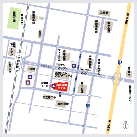 【お車をご利用のお客様】 ■東京~山形まで、約5時間 ■山形自動車道/山形蔵王ICより山形駅東口方面へ4km、車で約10分 東北自動車道村田JCTから山形自動車道、山形蔵王ICより一般道へ ■東北中央道/山形中央ICより山形駅東口方面へ6km、車で約15分 【JRをご利用のお客様】 ■東京駅~(山形新幹線) 山形駅 … 2時間30分 ■福島駅~(山形新幹線) 山形駅 … 1時間10分 ■仙台駅~(仙山線) 山形駅 … 1時間30分 ■山形駅東口より、徒歩5分 【徒歩でお越しのお客様】 ■山形駅東口より、徒歩約5分 駅前大通り直進、山交ビル=バスターミナル南側(隣接) ■高速バス(仙台、新潟、庄内他)バスターミナル隣接、徒歩1分 【航空機をご利用のお客様】 ■羽田空港~山形空港 45分 ■山形空港から車またはバスで 40分