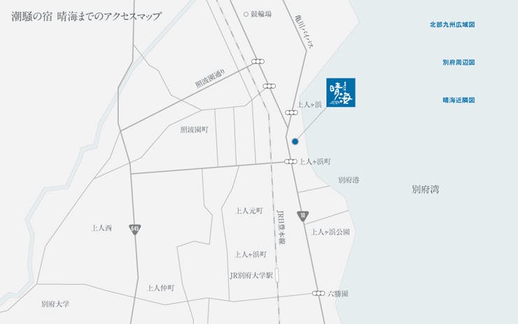 ■飛行機をご利用の場合 大分空港からタクシーで約40分 ■フェリーをご利用の場合 別府国際観光港からタクシーで約5分 ■新幹線をご利用の場合 博多駅~別府駅まで約2時間、 小倉駅~別府駅まで約1時間15分 別府駅からタクシーで約15分 ■お車をご利用の場合 太宰府IC~別府ICまで約2時間、 別府ICから約15分