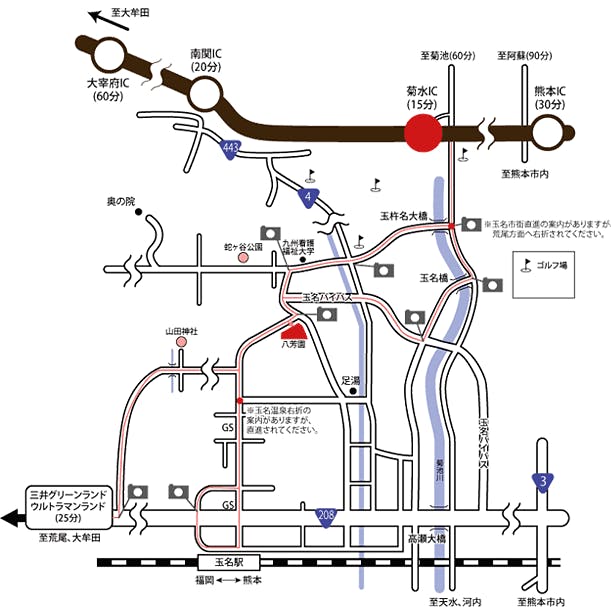 【車でお越しのお客様】 ■「菊水」ICより(約15分) 県道16号線を玉名方面に約8km。 ■熊本市内より(約60分) 国道3号線を植木方面に約15km。植木交差点を左折、国道208号線を玉名方面に約15km 。 ■福岡市内より<高速利用>(約90分) 都市高速から九州自動車道に入って「菊水」ICまで。県道16号線を玉名方面に約8km。 ■熊本空港より<高速利用>(約60分) 県道36号線を益城熊本空港IC方面に約8km。「益城熊本」ICより九州自動車道に入って「菊水」ICまで。県道16号線を玉名方面に約8km。 【電車でお越しのお客様】 ■JR鹿児島本線「玉名」駅下車(約2km) タクシーで5分。 徒歩35分。 ■JR新幹線「新玉名」駅下車(約4km) タクシーで8分。