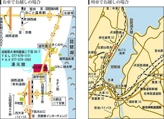 ■電車でお越しの場合 ・JR湖西線「京都駅」~「おごと温泉駅」(約20分)下車、送迎バスにて約5分 ・JR湖西線「大阪駅」~「比叡山坂本駅」(約50分)下車、送迎バスにて約10分※新快速にお乗りの場合のみ ※送迎をご希望の場合は、到着時にご連絡下さいませ。 ■お車でお越しの場合 名神高速「豊中IC」~「京都東IC」(約40分)、西大津バイパス経由約20分。