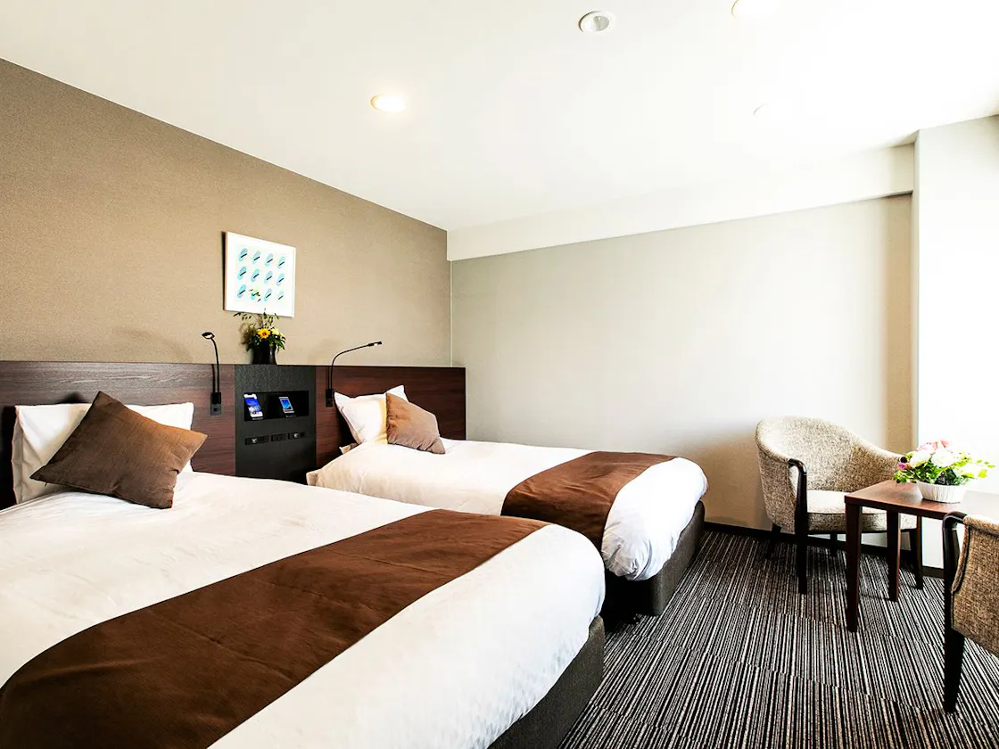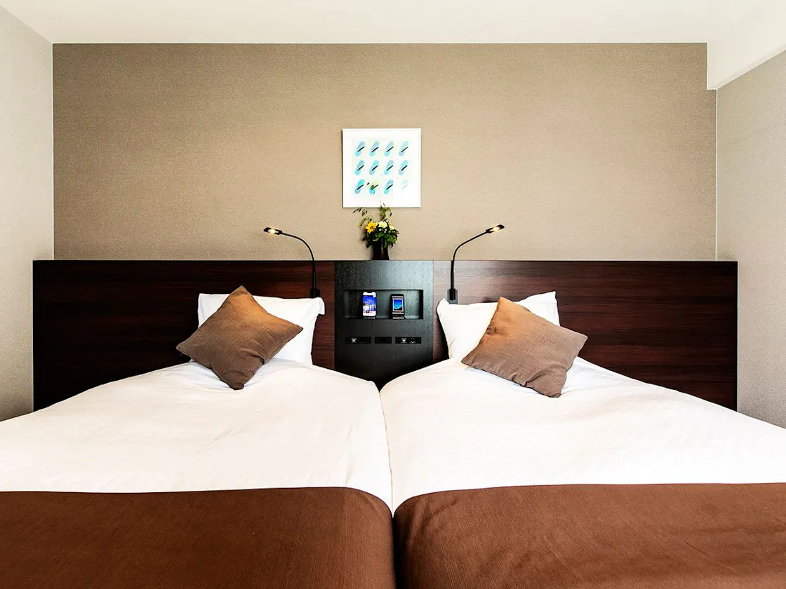 セミダブルのベッドを繋げた、240センチ幅の大きなベッドが魅力の【ハリウッドツイン】 部屋で過ごすひとときも、大切な想い出にしたいという貴方へ。 上質な休息だけでなく、滞在の快適さにもこだわった “心やわらぐ”癒しの空間です。 ■ミラーリング機能付きテレビ 全室導入! スマートフォンの画面を大画面テレビモニターに映し出し 映画やスポーツ中継、ゲームなどを大迫力で楽しめます。 プライベートからビジネス利用まで幅広く活用することができます。 ■設備 23平米、ベッド:Serta社セミダブル(120×200)×2台、テンピュール枕 Wi-Fi、40型ミラーリング機能付液晶テレビ、VOD(有料ch)、冷暖房個別空調 マイナスイオンドライヤー、消臭スプレー、電気ポット、冷蔵庫、日本茶セット ■アメニティ シャンプー、コンディショナー、ボディソープ、 髭剃り、歯磨きセット、ナイトウェア バスタオル、フェイスタオル、ハンドタオル、スリッパ、ブラシ