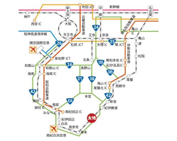■自動車をご利用の場合 ○松原JCT~阪和道・海南湯浅道・湯浅御坊道・阪和道・南紀田辺IC~国道424号~国道42号~太地 ○名古屋西JCT~東名阪道・伊勢道~勢和多気IC~紀伊長島IC~国道42号~海山IC~尾鷲北IC~国道42号~太地 ■電車をご利用の場合 ○新大阪~JR紀勢本線特急くろしお~太地(新大阪~太地 約3時間40分) ○名古屋~JR紀勢本線特急ワイドビュー南紀~紀伊勝浦~太地(名古屋~太地 約3時間30分) ■飛行機をご利用の場合 ○東京(羽田空港)~南紀白浜空港~JR白浜駅~JR紀勢本線特急くろしお~太地(羽田空港~太地約4時間20分) ○東京(羽田空港)~大阪(関西国際空港)~JR関西空港駅~日根野駅~JR紀勢本線特急くろしお~太地(羽田空港~太地約5時間20分)