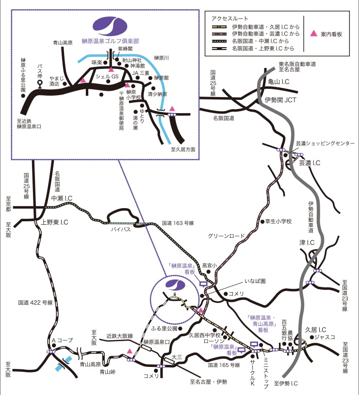 【お車でお越しのお客様】 ■伊勢自動車道・久居I.Cから約11km、車で約15分 ■伊勢自動車道・芸濃I.Cから約17km、車で約25分 ■名阪国道・上野東I.Cから約38km、車で約50分 【公共交通機関でお越しのお客様】 近鉄大阪線「榊原温泉口駅」から約7km、車で約15分