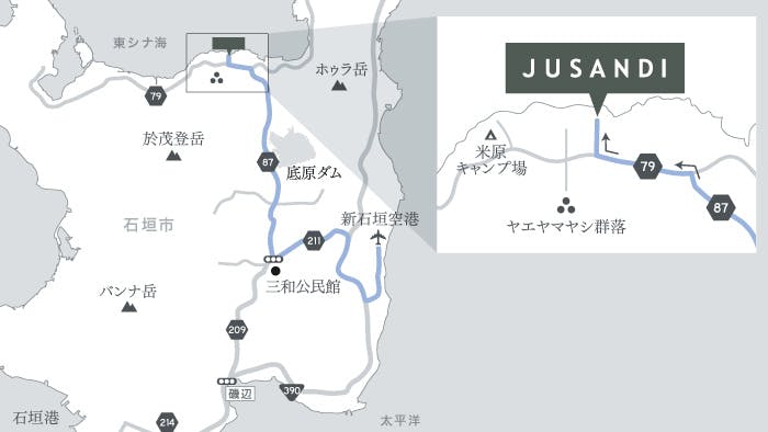 「新石垣空港」へは、羽田空港・関西空港・中部空港・福岡空港より直行便がございます(約3時間)。 その他の空港からお越しの場合は、那覇空港でお乗り換えください(那覇→石垣 約1時間)。 <新石垣空港からJUSANDIまでのご案内> ■路線バスご利用の場合 東運輸株式会社【系統11】 米原キャンプ場線乗車/米原ヤシ林入口下車 ■お車の場合(約15分) 県道211号を直進 → 三和公民館交差点を右折 → 県道209号を直進 → そのまま県道87号へ → 於茂登トンネルを抜けて突き当りを左折 → 県道79号を1km程直進すると右側に看板が見えますので、右折してください。