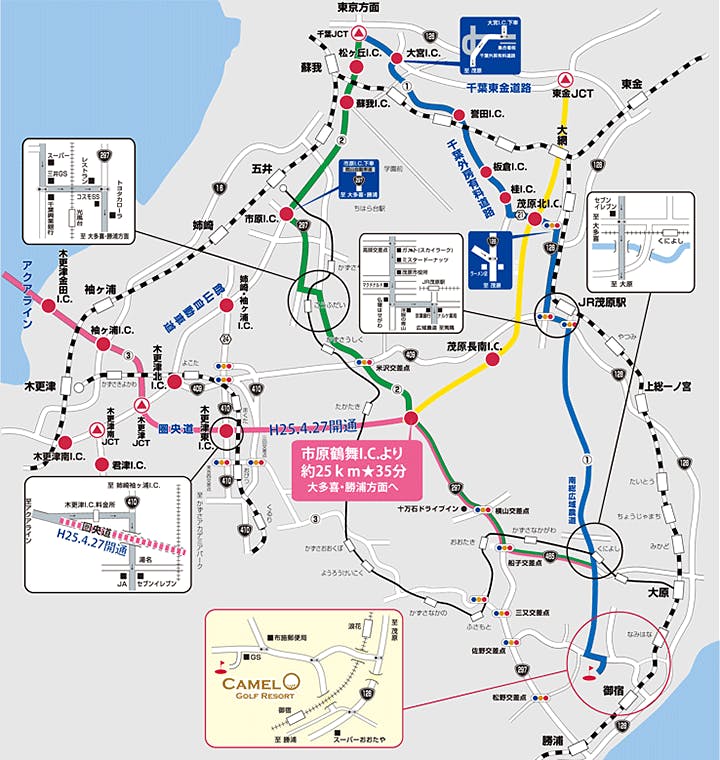 京葉道路→千葉東金道路→圏央道(茂原方面)→市原鶴舞IC下車→国道297線経由約35分