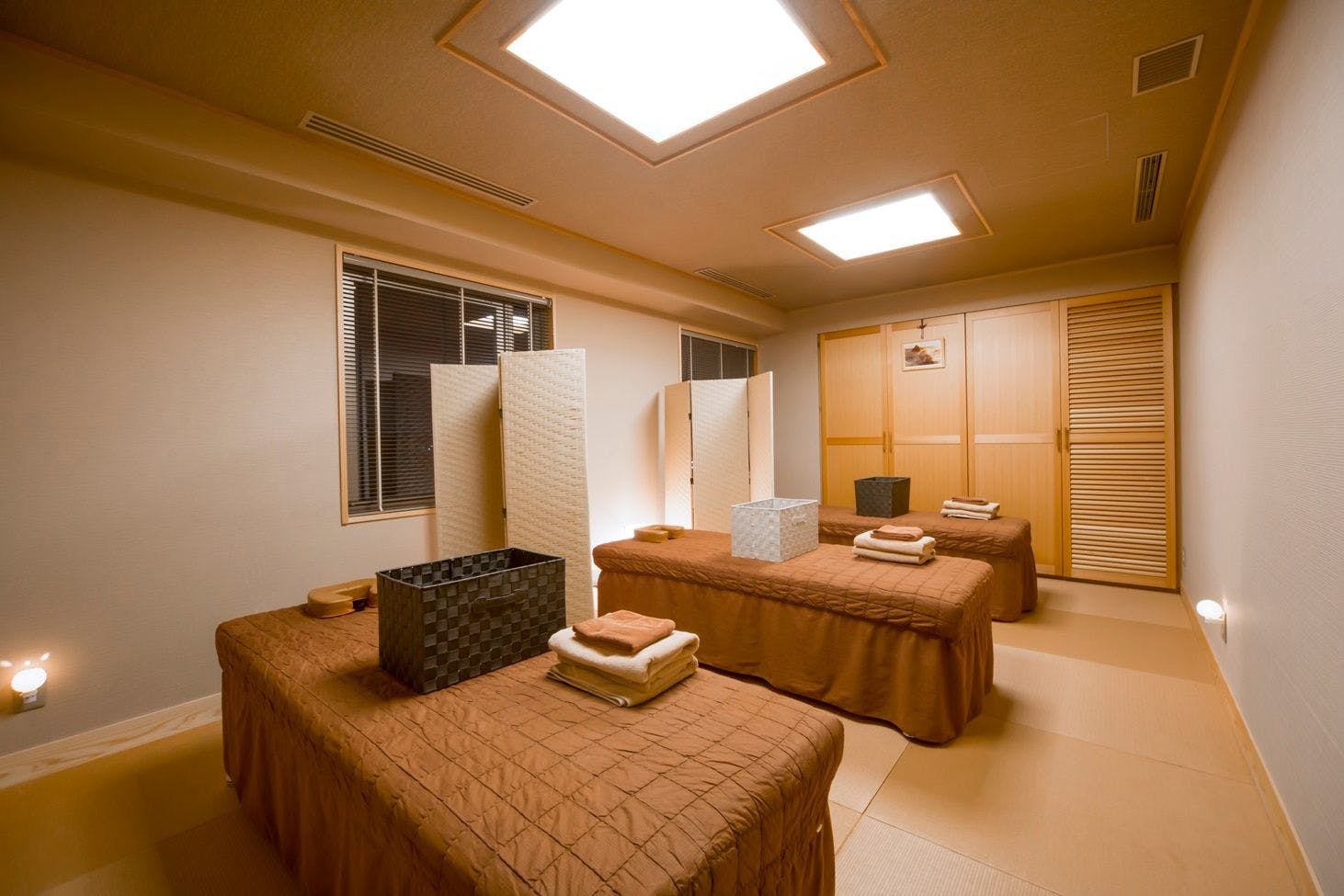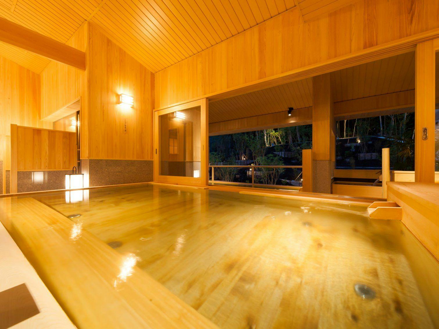 大浴場は、岩風呂の「森の湯」と檜風呂の「社の湯」があり、朝夕入れ替え制で異なる趣の湯浴みを。「長寿の湯」と言われる新美里温泉から運ばれる天然温泉をお愉しみください。