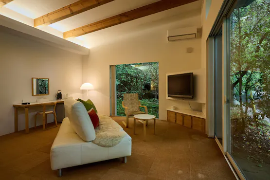 標高600mの湯布院塚原高原の森の中、鳥のさえずり、木々の緑、風の香り。その全てが心を満たしてくれます。 塚原高原の森の素晴らしいロケーションが織りなす非日常に身を委ね、極上の癒しを実感していただけます。