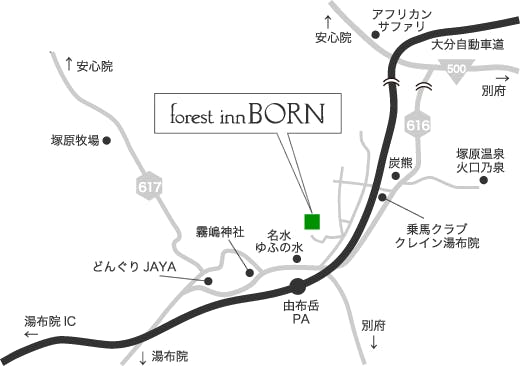 【電車・バスでお越しの方】 ■大分空港からノンストップバスご利用で由布院駅まで約55分 ■別府駅西口からバスご利用で由布院駅まで約50分 ■JR博多駅からJR特急ゆふいん森号ご利用で由布院駅まで約2時間10分 ※JR由布院駅からはタクシーで15分。 【お車でお越しの方】 ■大分空港から大分空港道路ご利用で由布院まで約60分 ■福岡ICから高速道路ご利用で由布院ICまで約1時間30分 ■熊本ICから高速道路ご利用で由布院ICまで約1時間50分 ※大分自動車道湯布院ICより20分