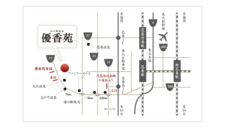 お車をご利用の場合 ・花巻南IC降り口を左折、最初の信号を右折して、県道12号線へ。道なりに10kmを真っ直ぐ ・シャトルバスは事前予約制でございます。シャトルバスご利用の際は4日前までにご乗車のお時間を備考欄にご記入またはお電話にてご連絡お願いいたします。 ※事前予約制ではありますが、定刻になりましたら出発いたしますので、ご注意ください。 東北新幹線新花巻駅から優香苑までの交通機関 ・タクシー利用の場合 所要時間約45分(目安) ・花巻南温泉郷の無料シャトルバス利用の場合 所要時間約50分(目安) 出発時間 新花巻駅 15:10、16:10、17:10の3便 出発場所 新花巻駅西口バスターミナル2番乗り場 花巻駅から優香苑までの交通機関 ・タクシー利用の場合 所要時間約35分(目安) ・花巻南温泉郷の無料シャトルバス利用の場合 所要時間約45分(目安) 出発時間 花巻駅 15:25、16:25、17:25の3便 出発場所 花巻駅東口無料シャトルバス乗り場 路線バスをご利用の場合 所要時間約40分(目安) ・花巻・大迫地区 路線バス 湯口線 花巻駅(乗車)→山の神温泉(下車)