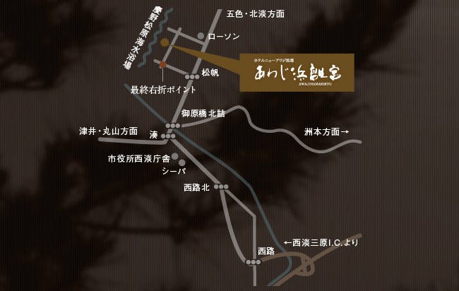 JR「三ノ宮」「高速舞子」より高速バス乗車→「陸の港西淡」「西淡志知」下車→送迎バスで約7分