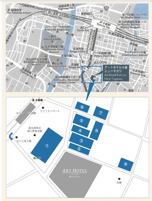■JR 新幹線小倉駅下車徒歩8分 ■モノレール JR小倉駅直結モノレール(100円)2駅目旦過駅より徒歩2分 ■車 [本州方面・行橋・大分方面]九州自動車道より北九州都市高速に入り足立ICより2km [行橋・大分方面]北九州都市高速に入り大手町ランプ下車、モノレール前左折、旦過駅右折 [福岡方面]自動車道八幡ICより都市高に入り、柴川JCTを小倉方面へ