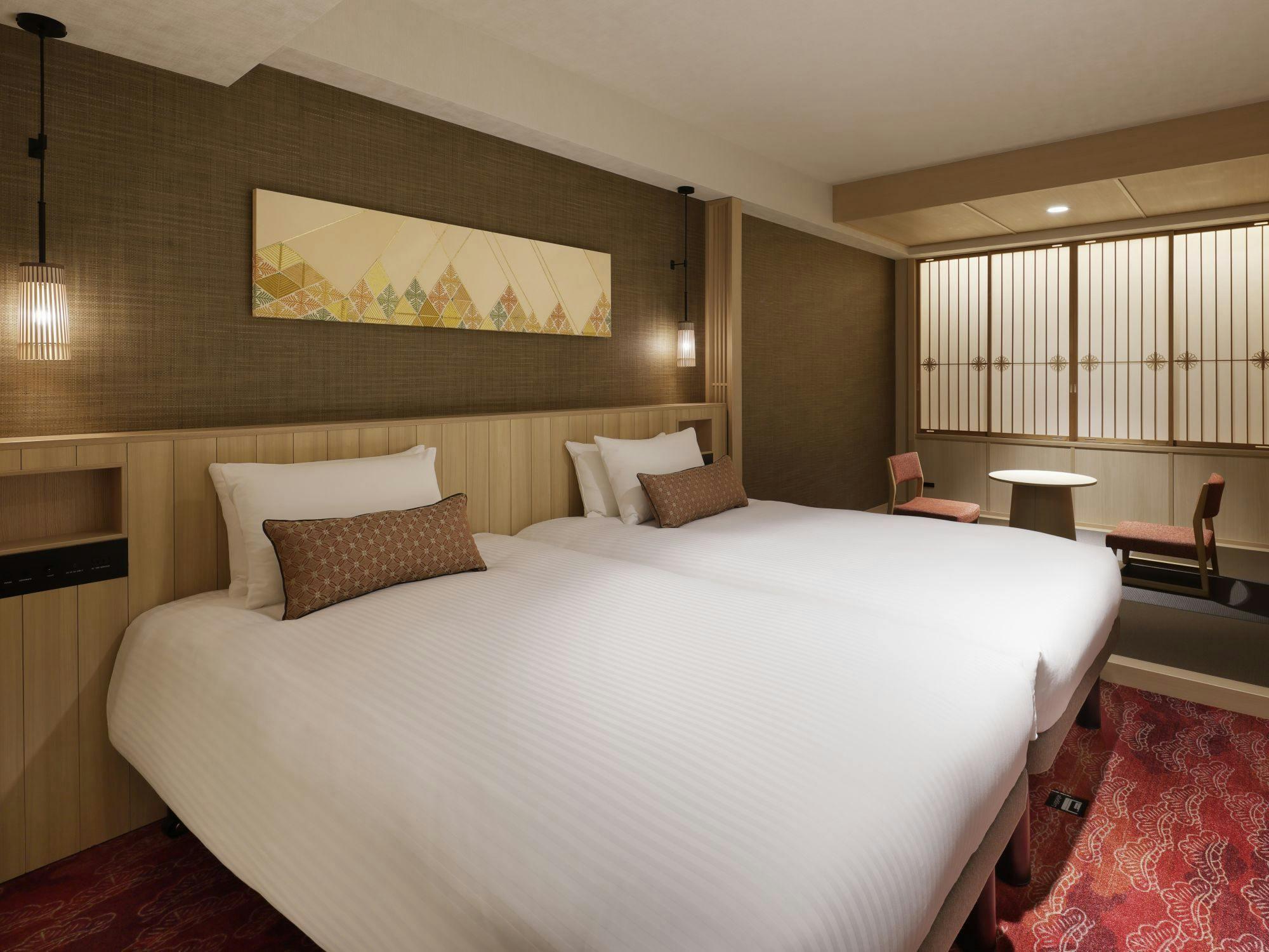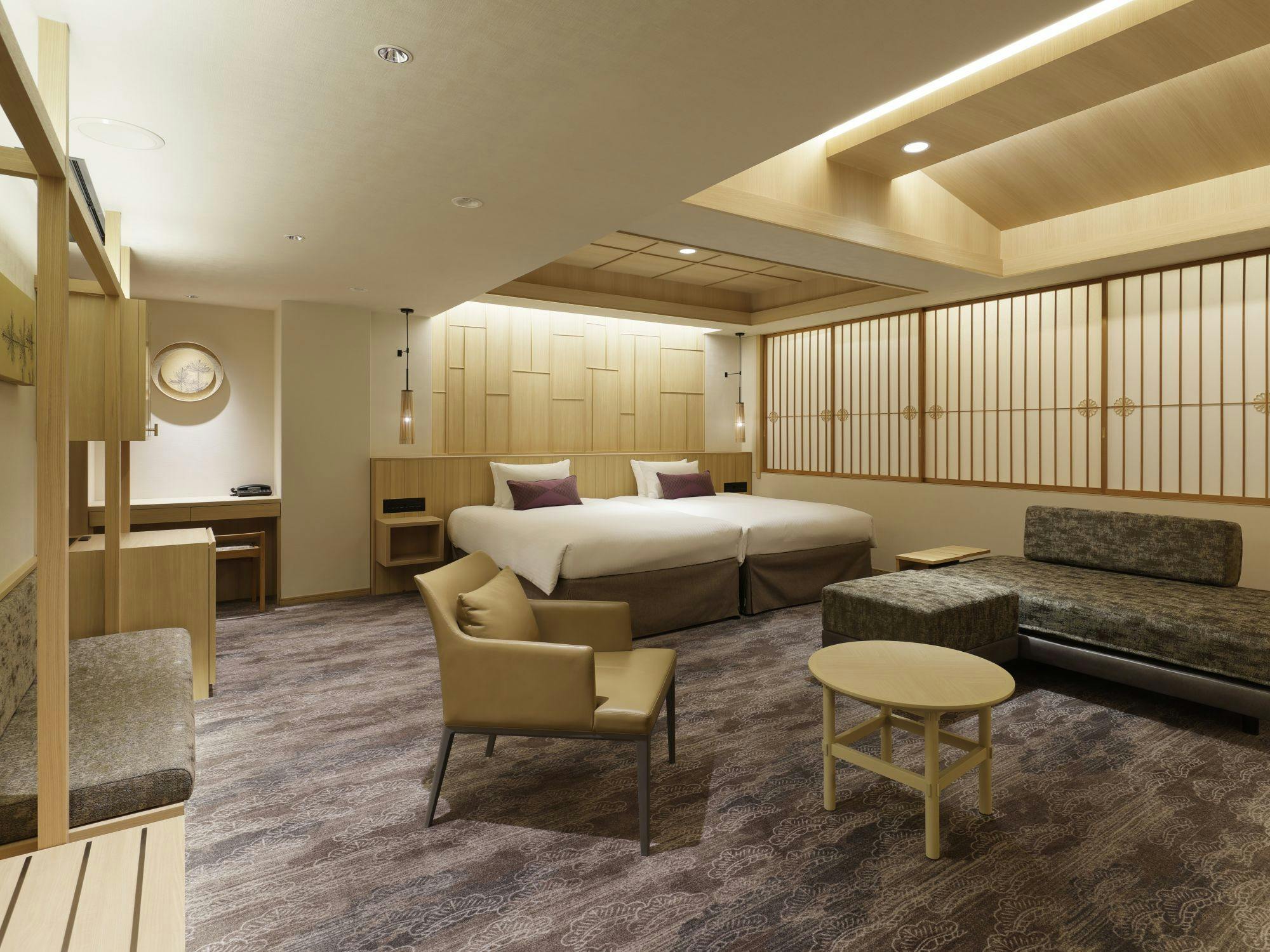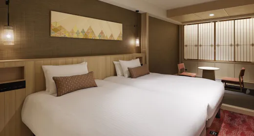ゆとりあるソファセットとハリウッド仕様のツインベッドを配した客室です。 京都の趣を感じる和モダンな雰囲気が特長の、スタンダードタイプの客室です。 ※客室の窓は開閉できません。また、お客様と近隣住民の方相互のプライバシー保護の為、すりガラスとなっております。 ■ベッドサイズW110cm×2台 ■40インチ以上の大型テレビ ■サータ社製マットレス ■ロフテー社と共同開発したオリジナル快眠枕 ■フリーアクセス可能なWi-Fi環境 ■加湿機能付き空気清浄器