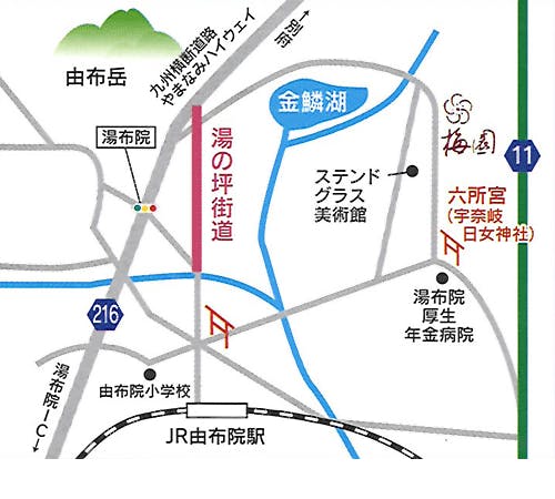 羽田空港→大分空港(大分交通バス)→JR久大本線由布院駅→車で5分(徒歩約30分)→梅園