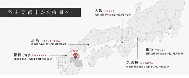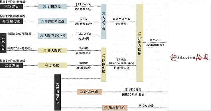 ■飛行機で ・東京方面(梅園まで2時間35分) 羽田空港→大分空港(大分交通バス)→JR久大本線由布院駅→車で5分(徒歩約30分)→梅園 ・名古屋方面(梅園まで約2時間20分) 中部国際空港→大分空港(大分交通バス)→JR久大本線由布院駅前→車で5分(徒歩約30分)→梅園 ・大阪方面(梅園まで約2時間5分) 大阪(伊丹)空港→大分空港(大分交通バス)→JR久大本線由布院駅前→車で5分(徒歩約30分)→梅園 ■電車で ・大阪方面(梅園まで約4時間40分) 新大阪駅(新幹線)→JR博多駅→(JR特急「ゆふいんの森・ゆふ」)→JR久大本線由布院駅→車で5分(徒歩約30分)→梅園 ・広島方面(梅園まで約3時間20分) 広島駅(新幹線)→JR博多駅→(JR特急「ゆふいんの森・ゆふ」)→JR久大本線由布院駅→車で5分(徒歩約30分)→梅園 九州各地から ・JR博多駅→(JR特急「ゆふいんの森・ゆふ」)→JR久大本線由布院駅→車で5分(徒歩約30分)→梅園 ■お車で ・大分自動車道~湯布院IC~出口を出て突き当たりまで進む。突き当たりを右折し由布院市街へ