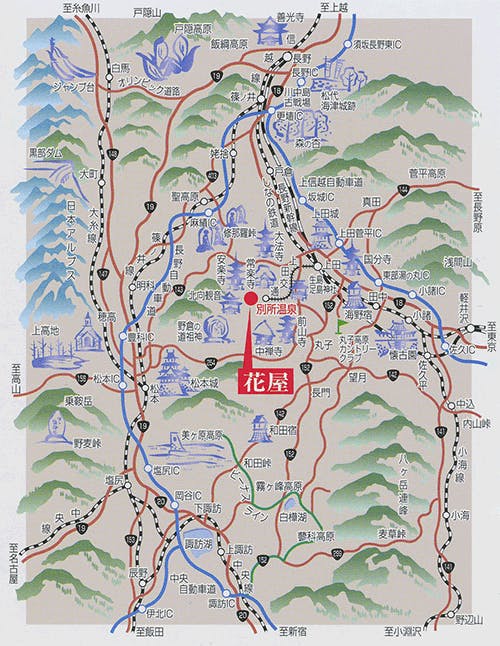■お車にて ・神奈川・東京~別所温泉まで 所要時間:車で約2時間40分 ・静岡・名古屋~別所温泉まで 所要時間:車で約3時間20分 ・大阪・京都~別所温泉まで 所要時間:車で約5時間40分 ・新潟~別所温泉まで 所要時間:車で約3時間40分 ■電車にて(乗車時間:新幹線含む) ※上田電鉄別所線別所温泉駅より最も近い旅館です。 ・東京~別所温泉まで 乗車時間:約2時間 ・名古屋~別所温泉<上田駅経由>まで 乗車時間:約3時間30分 ・名古屋~別所温泉<松本駅経由>まで 乗車時間:JR&バスで約3時間10分 ・新潟~別所温泉まで 乗車時間:約2時間30分 ・金沢~別所温泉まで 乗車時間:約2時間30分 ・福井~別所温泉まで 乗車時間:約3時間00分