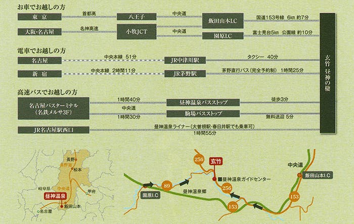 ■お車の場合 <名古屋・関西方面から> 中央自動車道 園原ICより【県道89号】【国道256号】経由で約10分 <長野・東京方面から> 中央自動車道 飯田山本ICより【国道153号】【国道256号】経由で約10分 ■電車の場合 <名古屋・関西方面から> JR中央線「中津川駅」よりタクシーで約40分。 【バス中津川便】 一日一便。事前予約制にて「昼神温泉」下車、徒歩5分 <長野・東京方面から> JR中央線「上諏訪駅」より【バス上諏訪便】 一日一便。事前予約制にて「昼神温泉」下車、徒歩5分 ■バスの場合 <各方面から> 各高速バスにて阿智PA内にある「中央道昼神温泉(駒場)」よりタクシーにて約10分 <名古屋:名鉄バスセンターから> 13時および14時発【昼神温泉】にて下車 <東京:バスタ新宿から> 中央道昼神温泉(駒場)にて下車