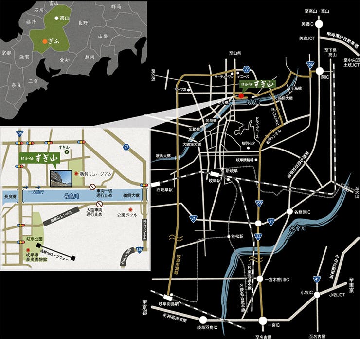 お車の場合 東海北陸自動車道・各務原ICより約20分 東海環状自動車道・岐阜ICより約15分 電車の場合 JR東海道本線・岐阜駅より車で約10分 名古屋鉄道・新岐阜駅より車で約10分