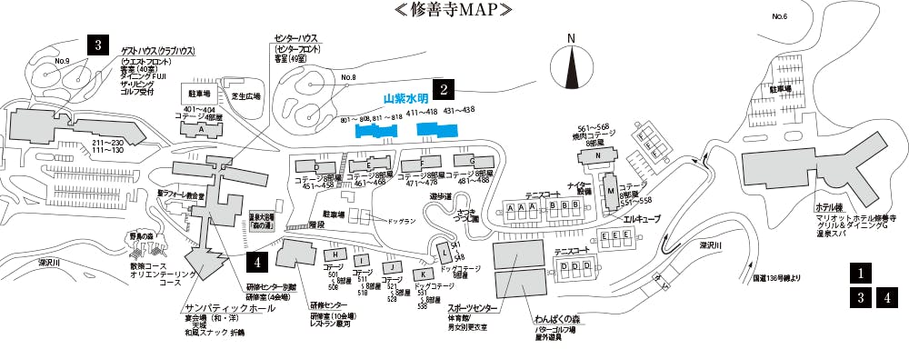 【1】フロント チェックインフロントは3ヶ所ございます。「ゲストハウス」へお越しください。 ※お日にちによりチェックインフロントが異なる場合がございます。当日施設内の看板をご覧ください。 ※施設構内では、移動のための循環バスを運行しております。 フロントにて時刻表をご用意しております。 お食事の際は、フロントまでご連絡いただければお迎えにあがります。 【2】山紫水明 別荘のようなプライベート空間が味わえる山紫水明。お部屋から望む豊かな自然に抱かれながら、ご家族やご夫婦、ご友人と、ゆったりとした上質な時間をお過ごしください。 【3】温泉施設 ・温泉大浴場 森の湯 天城連山の見晴らせる大きな内湯。その他に露天風呂やサウナがございます。 ・温泉スパ、岩盤浴(伊豆マリオットホテル修善寺内) 修善寺温泉を引きこんだ温浴施設。 男女ファミリー揃って楽しめる水着着用ゾーンと温泉本来の入浴を楽しむ男女別の浴場、 岩盤浴(有料)をご利用いただけます。