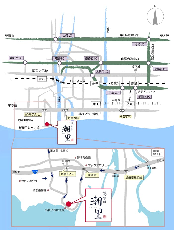 ■お車でお越しの方 ・阪神高速神戸線・加古川バイパス経由、姫路バイパス中地インター下車し南下。国道250号を西へ約20分。 ・山陽自動車道、龍野・龍野西インター下車、南へ20分。 ・中国自動車道、山崎インター下車、南へ60分。 ■電車でお越しの方 ・姫路駅よりお車で約40分。 ・JR網干駅よりお車で約15分。 ・山陽電鉄網干駅よりお車で約8分。 ※JR網干駅または山陽電鉄網干駅より送迎いたします。(要予約)
