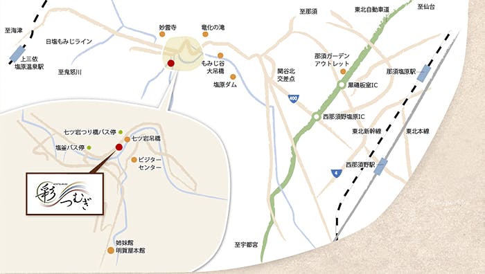 ■電車でお越しの場合 ○東北新幹線「那須塩原駅」よりバスで60分。「七ツ岩つり橋バス停」下車。 ○東北新幹線「那須塩原駅」よりタクシーで35分。 ○特急スペーシア「鬼怒川温泉駅」~会津鬼怒川線「上三依塩原温泉口」よりバスで40分。「七ツ岩つり橋バス停」下車。 ■お車でお越しの場合 ○東北自動車道「西那須野塩原I.C.」より国道400号で20分。 ■高速バスでお越しの場合 ○「新宿駅新南口」より高速バス 那須塩原リゾートエクスプレスで180分。「七ツ岩つり橋バス停」下車。