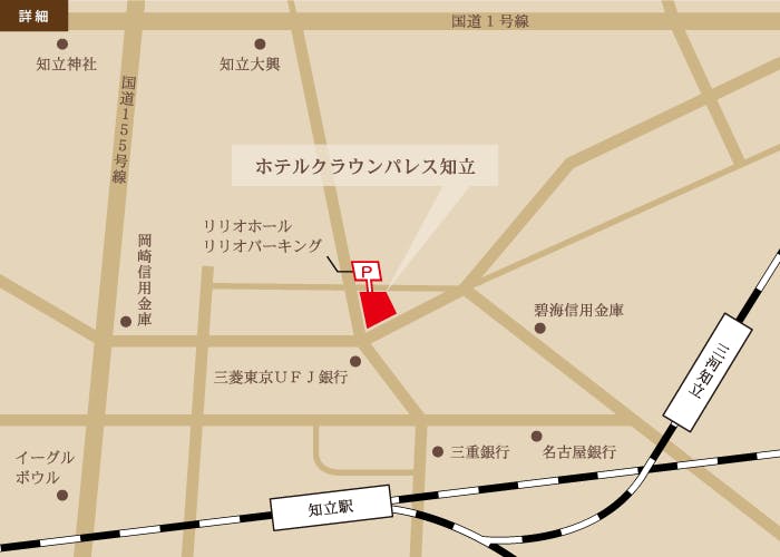 ■車でお越しの場合 【東京方面より】 東名高速(豊田JCT)→ 伊勢湾岸道(豊田南IC)より10分 【大阪方面より】 東名阪自動車道(四日市JCT)→ 伊勢湾岸道(豊田南IC)より10分 ■電車でお越しの場合 【JR新幹線 名古屋駅】 →(徒歩5分)→名鉄名古屋駅→(名鉄特急20分)→名鉄知立駅→(徒歩3分)→ホテル 【名古屋空港】 →(高速バスあおい交通18分)→名鉄名古屋駅→(名鉄特急20分)→名鉄知立駅→(徒歩3分)→ホテル 【中部国際空港】→(名鉄リムジンバス刈谷空港線68分)→名鉄知立駅→(徒歩3分)→ホテル ■中部国際空港へのアクセス 【高速バスをご利用】名鉄リムジンバス刈谷空港線68分 →名鉄知立駅→(徒歩3分)→ホテル 【電車をご利用】名鉄空港線 特急29分→名鉄神宮前→(名鉄名古屋本線特急14分)→名鉄知立駅→(徒歩3分)→ホテル