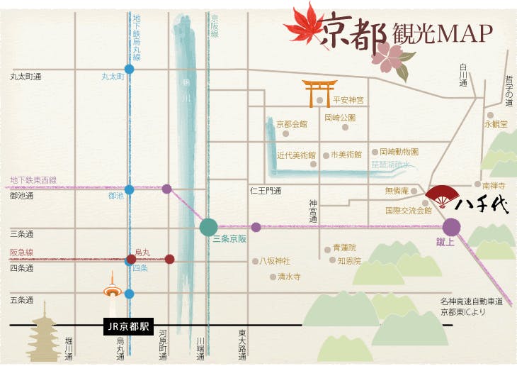 名神高速道路京都東ICより20分。 京都駅より地下鉄烏丸線御池駅にて乗り換え、地下鉄東西線「蹴上駅」より徒歩5分。