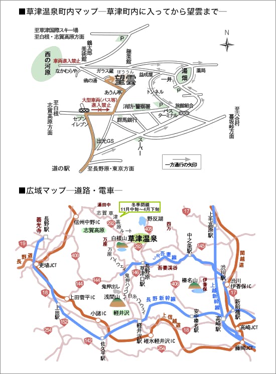 JR吾妻線長野原草津口駅下車、JRバス25分草津バスターミナル下車徒歩7分(バス停まで無料送迎あり)